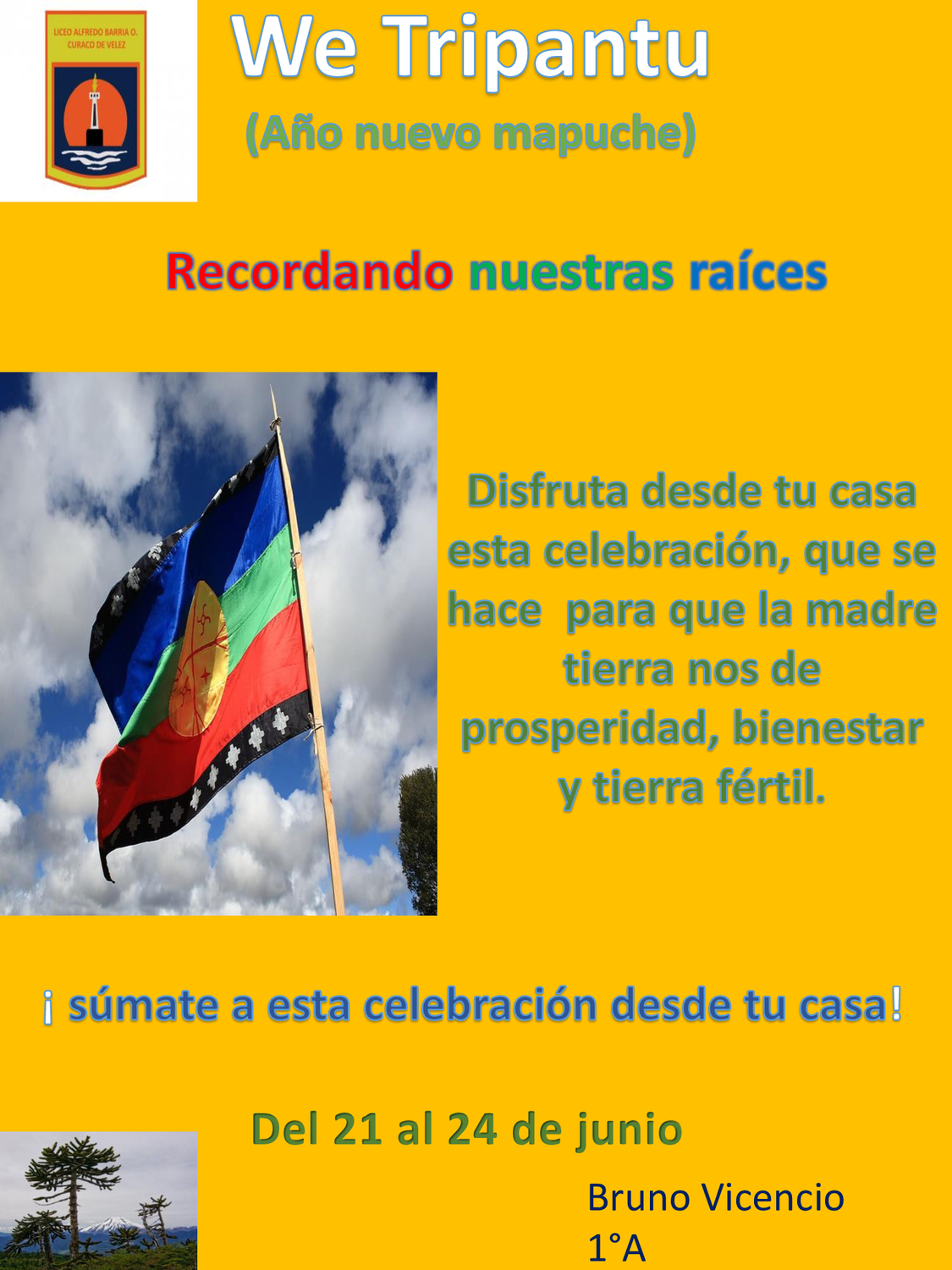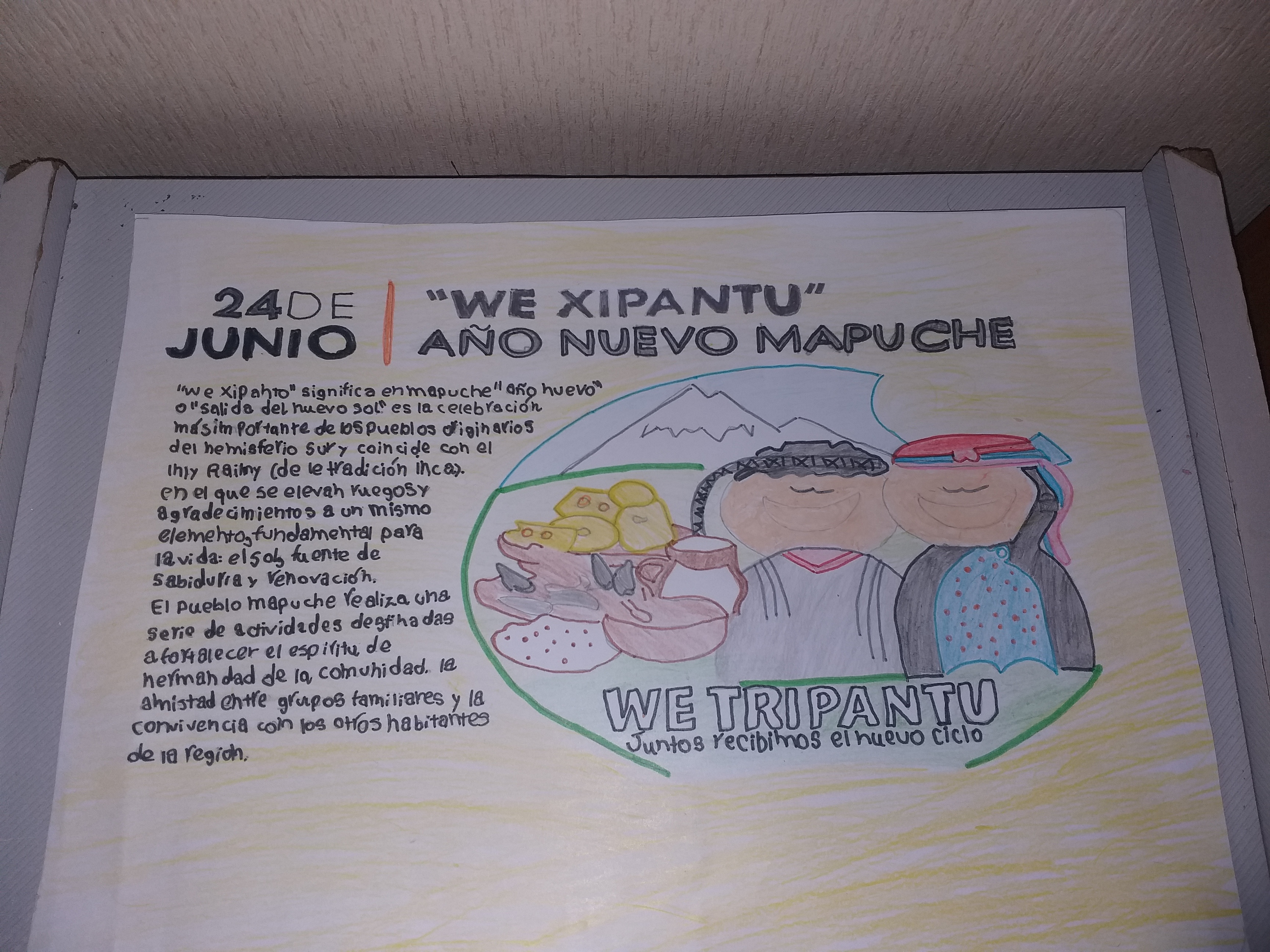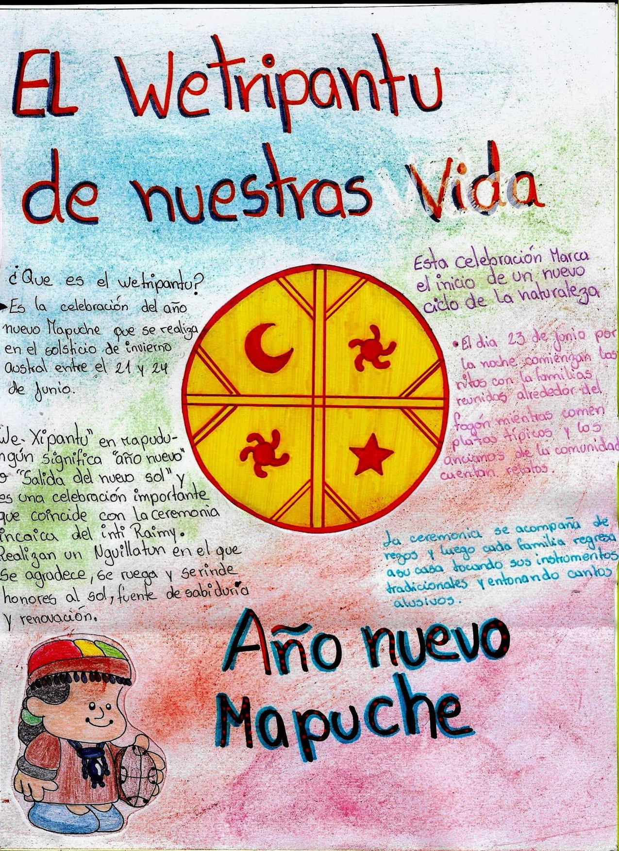 Hoy, 24 de Junio, Noche de San Juan y Wetripantru, fechas con mucho arraigo en nuestras comunidades, quiero dejar con Uds. El saludo y el cariño de nuestros y nuestras estudiantes con sus diferentes formas de expresión. La Profesora Loreto y el Profesor Elías, al igual que todos, confinados en sus casas nos comparten los trabajos de sus estudiantes en la asignatura de Lenguaje y Comunicación.